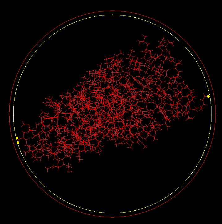 The initial and optimal spheres drawn around a protein. The small yellow disks show the atoms touching the smallest enclosing sphere.